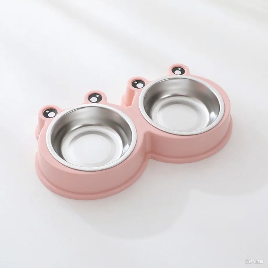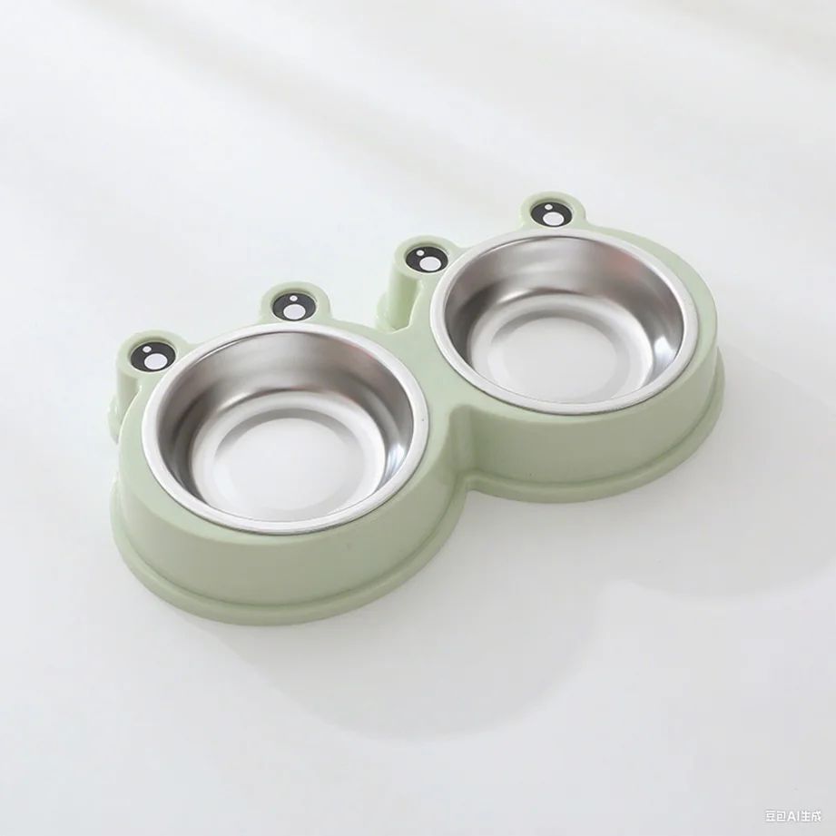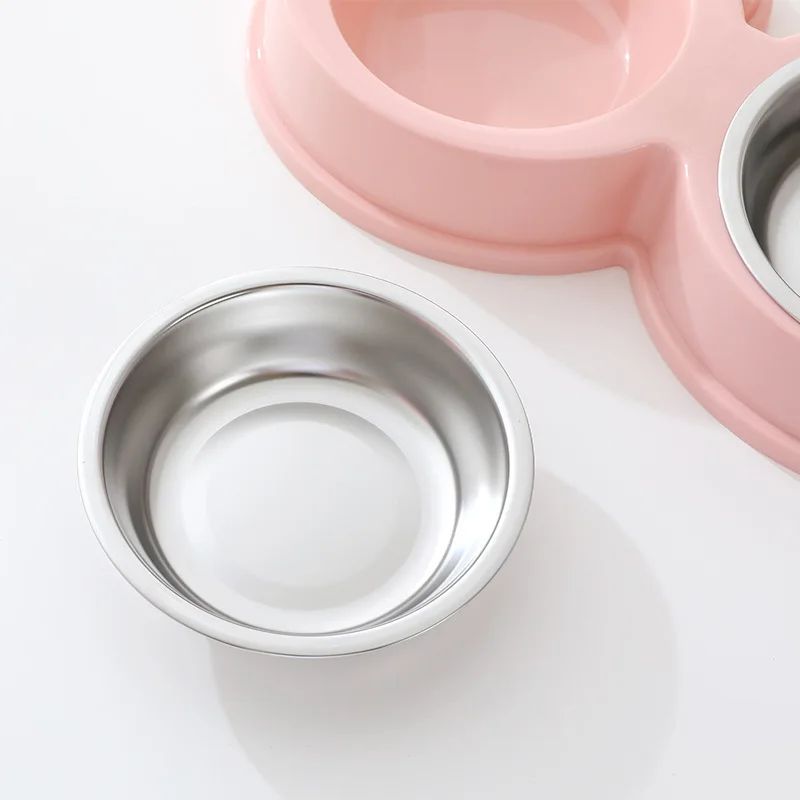 وعاء مزدوج بتصميم لطيف يناسب القطط، يحتوي على حامل بلاستيك ثابت مع وعاءين ستان ستيل قابلين للإزالة، مناسب للطعام الجاف والرطب والماء.