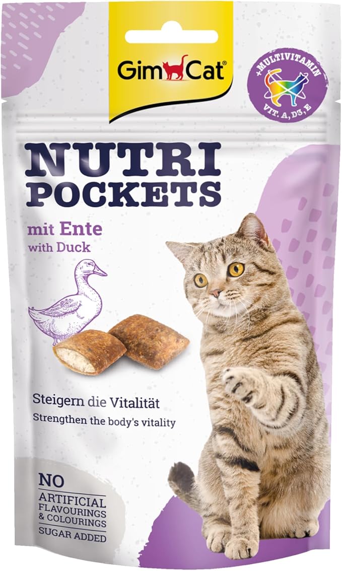 يُعتبر GimCat Nutri Pockets – Duck وجبة خفيفة مثالية تجمع بين المذاق اللذيذ للحوم البط والقوام المقرمش بالحشوة الكريمية لتمنح قطتك تجربة تغذية فاخرة ومتوازنة.
